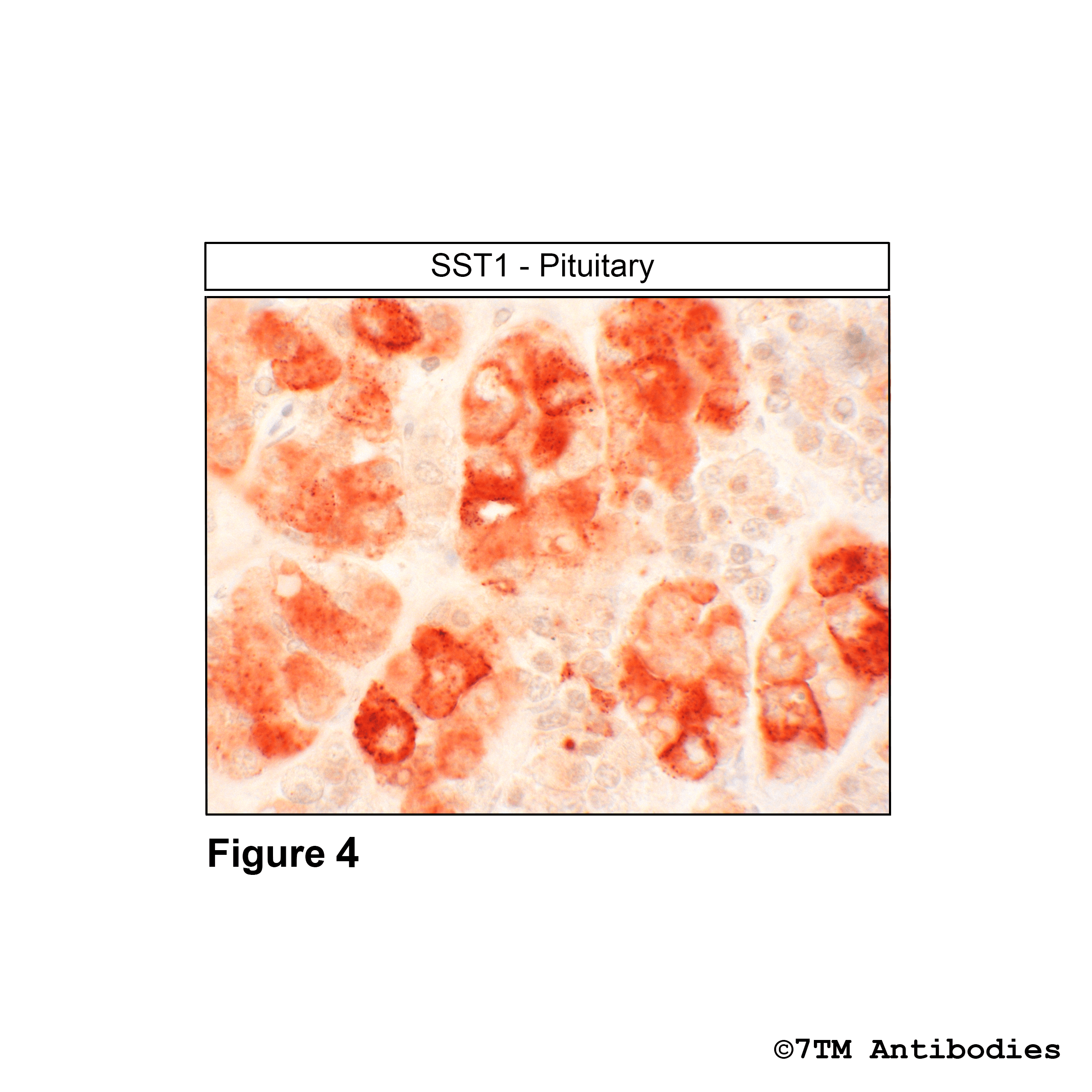 The SST1 receptor antibody is directed against the distal end of the carboxyl-terminal tail of human Somatostatin Receptor 1. It can be used to detect total SST1 receptors in Western blots independent of phosphorylation. The SST1 antibody can also be used to isolate and enrich SST1 receptors from cell and tissue lysates. It also detects SST1 in cultured cells and tissue sections by immunohistochemistry.