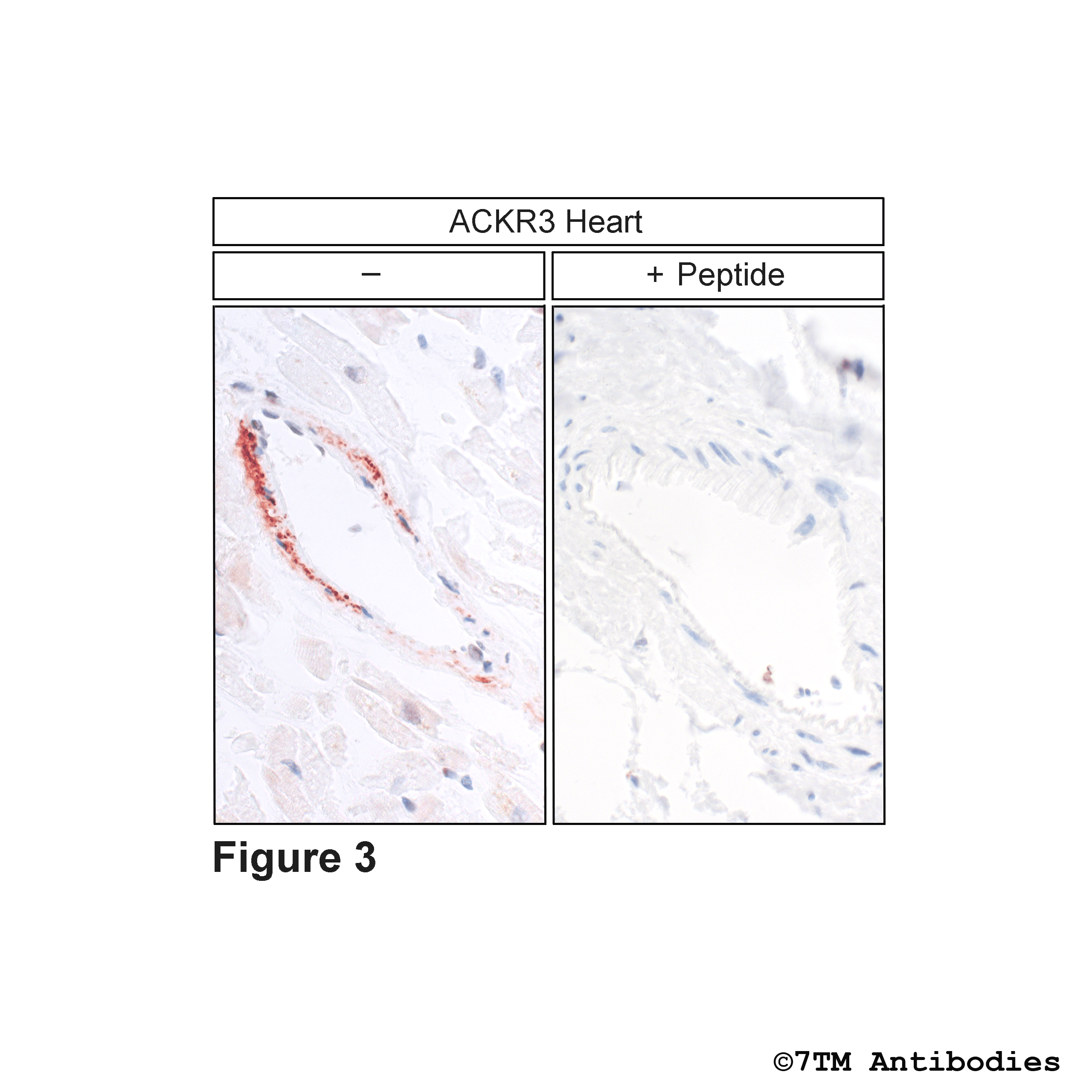 The ACKR3 receptor antibody is directed against the distal end of the carboxyl-terminal tail of human Atypical Chemokine Receptor 3. It can be used to detect total ACKR3 receptors in Western blots independent of phosphorylation. The ACKR3 antibody can also be used to detect ACKR3 in formalin-fixed, paraffin-embedded tissue sections by immunohistochemistry.
