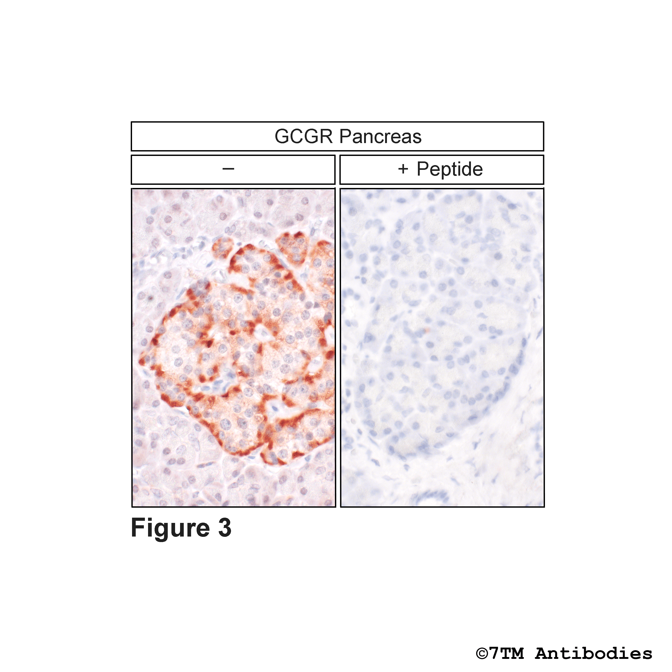 Figure 3. Immunohistochemical varification of  Glucagon Receptor antibody in pancreas. Sections were dewaxed, microwaved in citric acid, and not exposed (left pannel) or exposed to peptide (right pannel) that was used for production of anti-GCGR (non-phospho-Glucagon Receptor)) antibody (7TM0251N-IC). Sections were then incubated with anti-GCGR (non-phospho-Glucagon Receptor) antibody (7TM0251N-IC) at a dilution of 1:100 and sequentially treated with biotinylated anti-rabbit IgG and avidin-biotin solution. Sections were then developed in 3,3-diaminobenzidine (DAB)-glucose oxidase and lightly counterstained with hematoxylin. Note, only in sections without peptide incubation glucagon receptors were uniformly detected at the plasma membrane of cells.