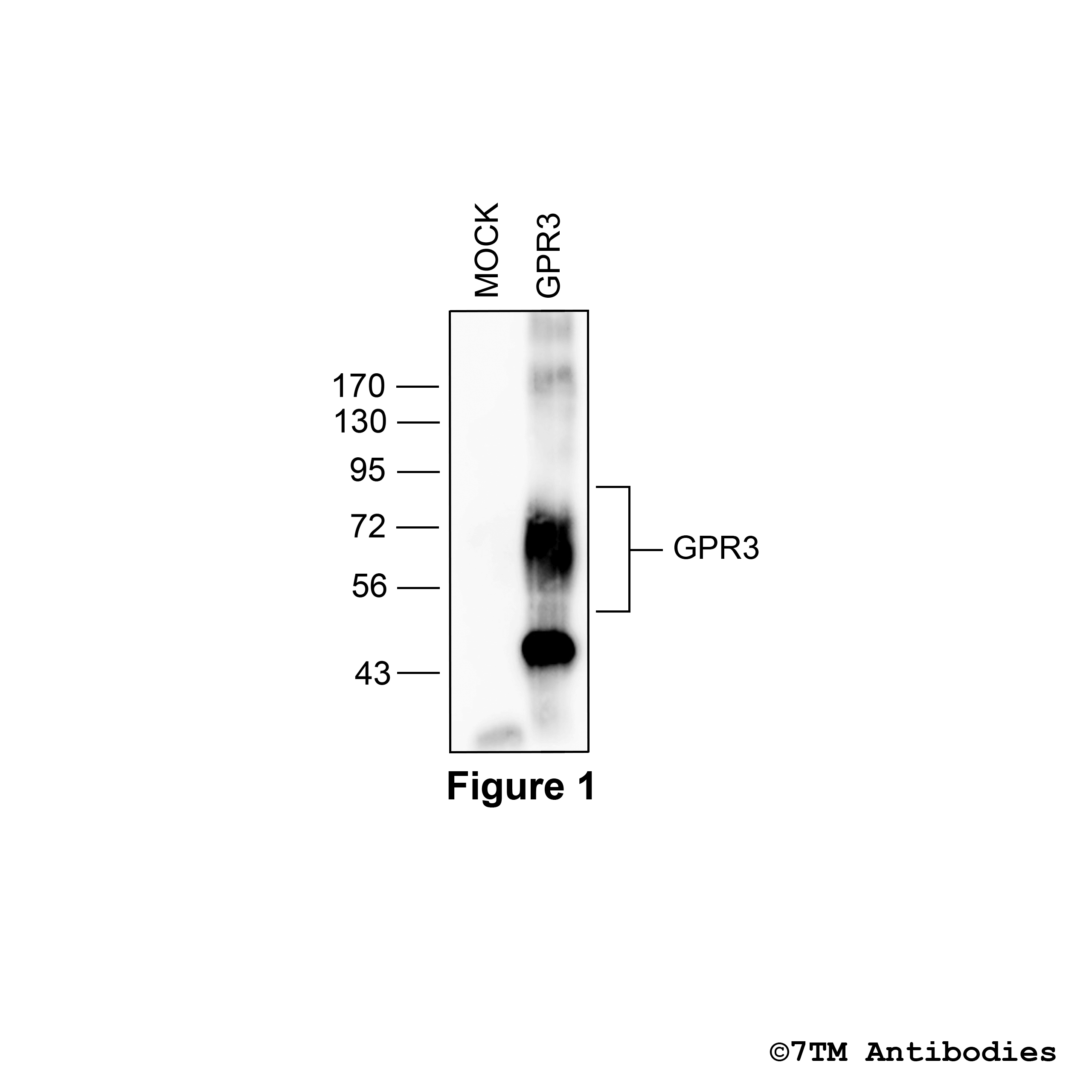 Figure 1. Validation of the GPR3 Receptor in transfected HEK293 cells. Native HEK293 cells (MOCK) or HEK293 cells stably expressing the GPR3 Receptor (GPR3) were lysed and immunoblotted with the phosphorylation-independent anti-GPR3 antibody (7TM0083N) at a dilution of 1:1000.