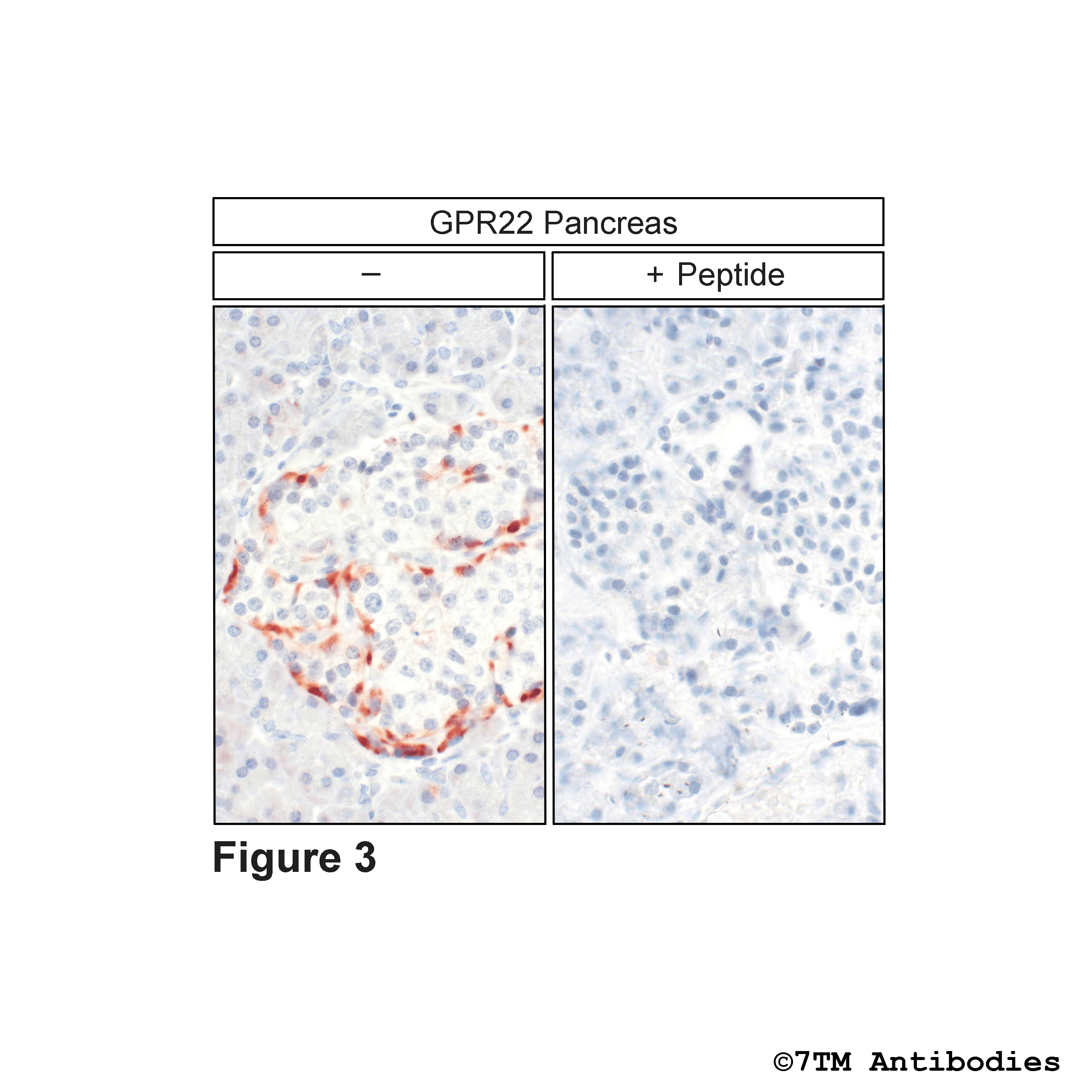 The GPR22 antibody is directed against the distal end of the carboxyl-terminal tail of mouse, rat and human GRP22. It can be used to detect total GPR22 receptors in Western blots independent of phosphorylation. The GPR22 antibody can also be used to isolate and enrich GPR22 receptors from brain lysates. It also detects GPR22 in cultured cells and tissue sections by immunohistochemistry.