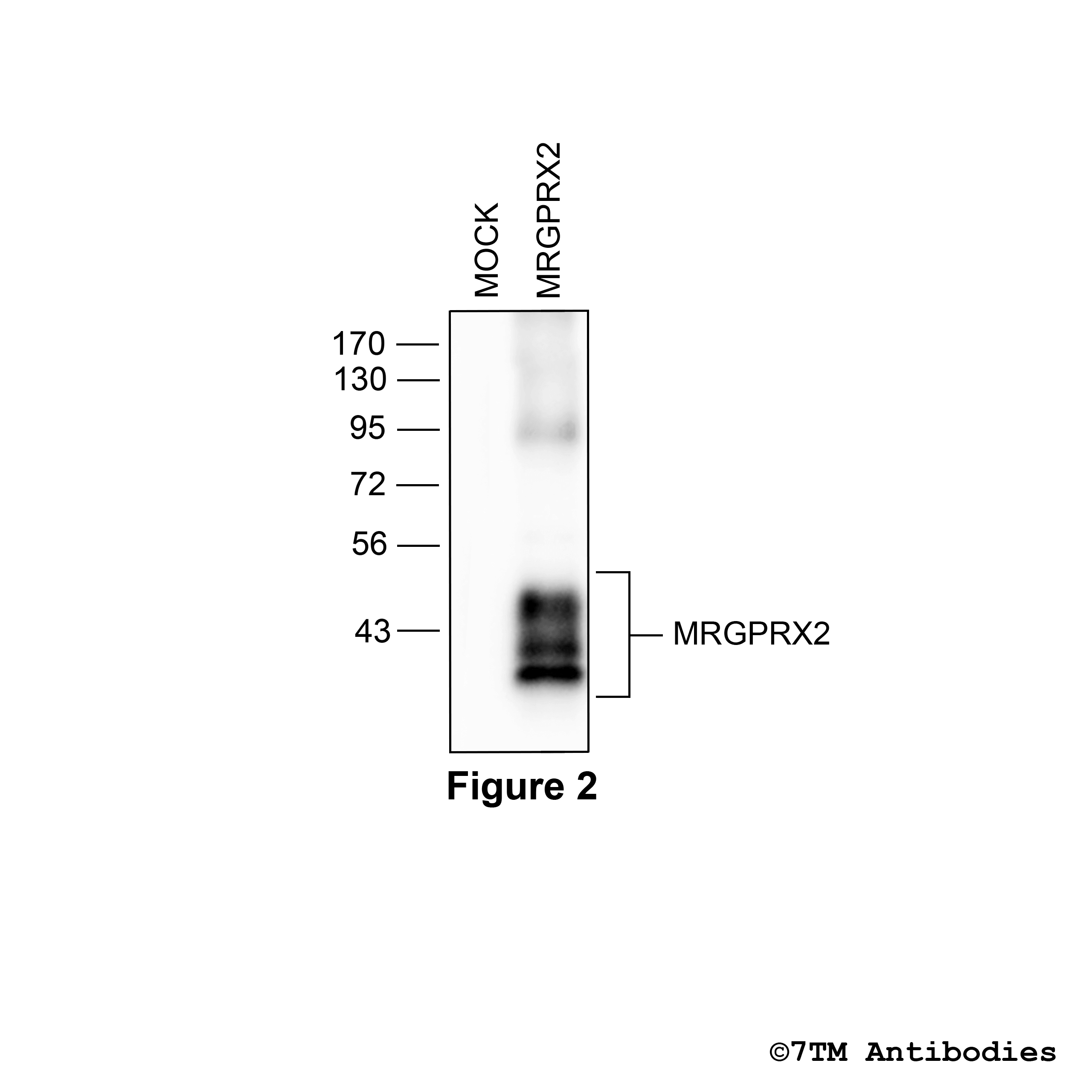 Figure 2. Validation of the MRGPRX2 Receptor in transfected HEK293 cells. Native HEK293 cells (MOCK) or HEK293 cells stably expressing the MRGPRX2 Receptor (MRGPRX2) were lysed and immunoblotted with the phosphorylation-independent anti-MRGPRX2 antibody (7TM0157N-IC) at a dilution of 1:1000.