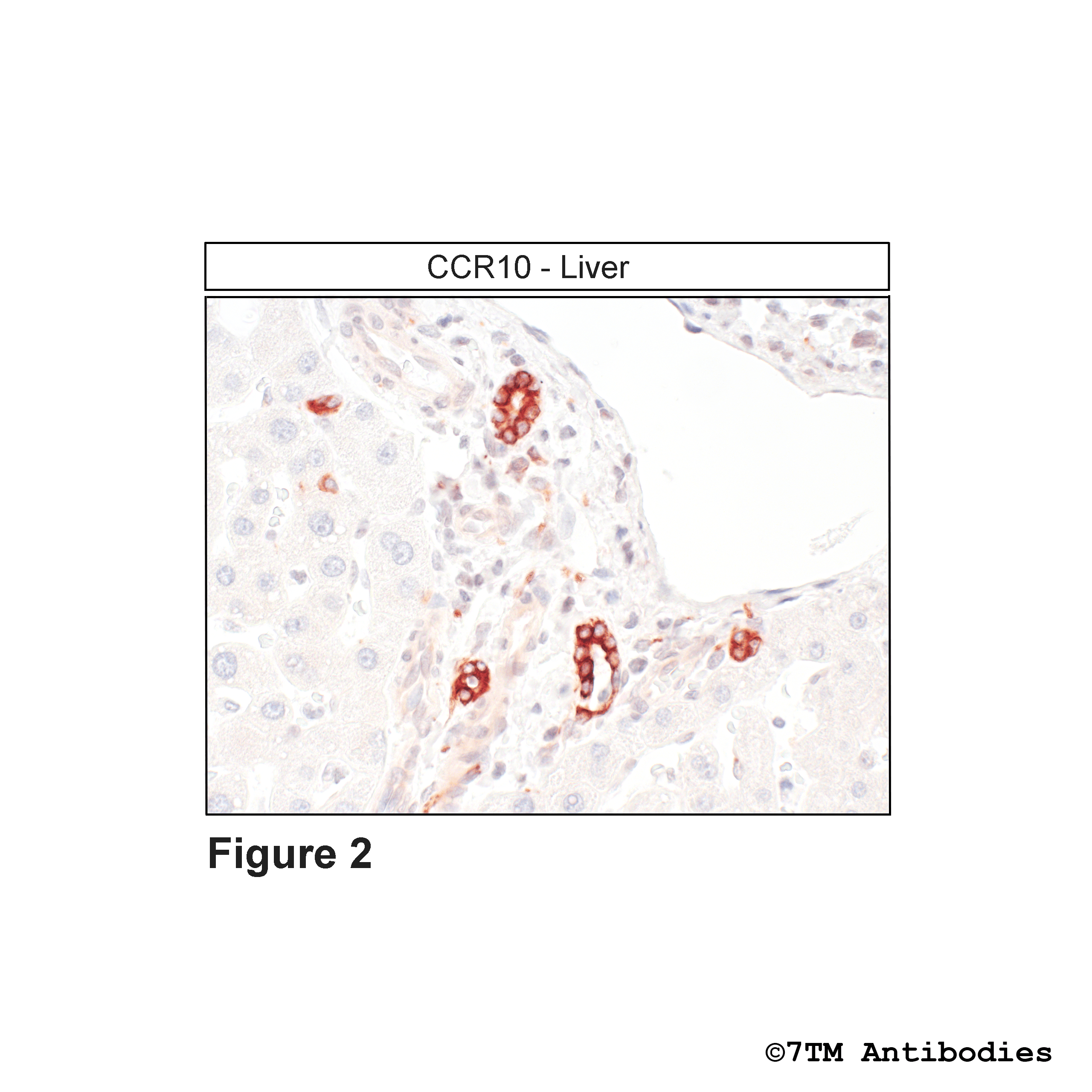 Figure 2. Immunohistochemical identification of CC Chemokine Receptor 10 in liver. Sections were dewaxed, microwaved in citric acid, and incubated with anti-CCR10 (CC Chemokine Receptor 10) antibody (7TM0067N-IC) at a dilution of 1:100. Sections were then sequentially treated with biotinylated anti-rabbit IgG and avidin-biotin solution. Sections were then developed in 3,3-diaminobenzidine (DAB)-glucose oxidase and lightly counterstained with hematoxylin.
