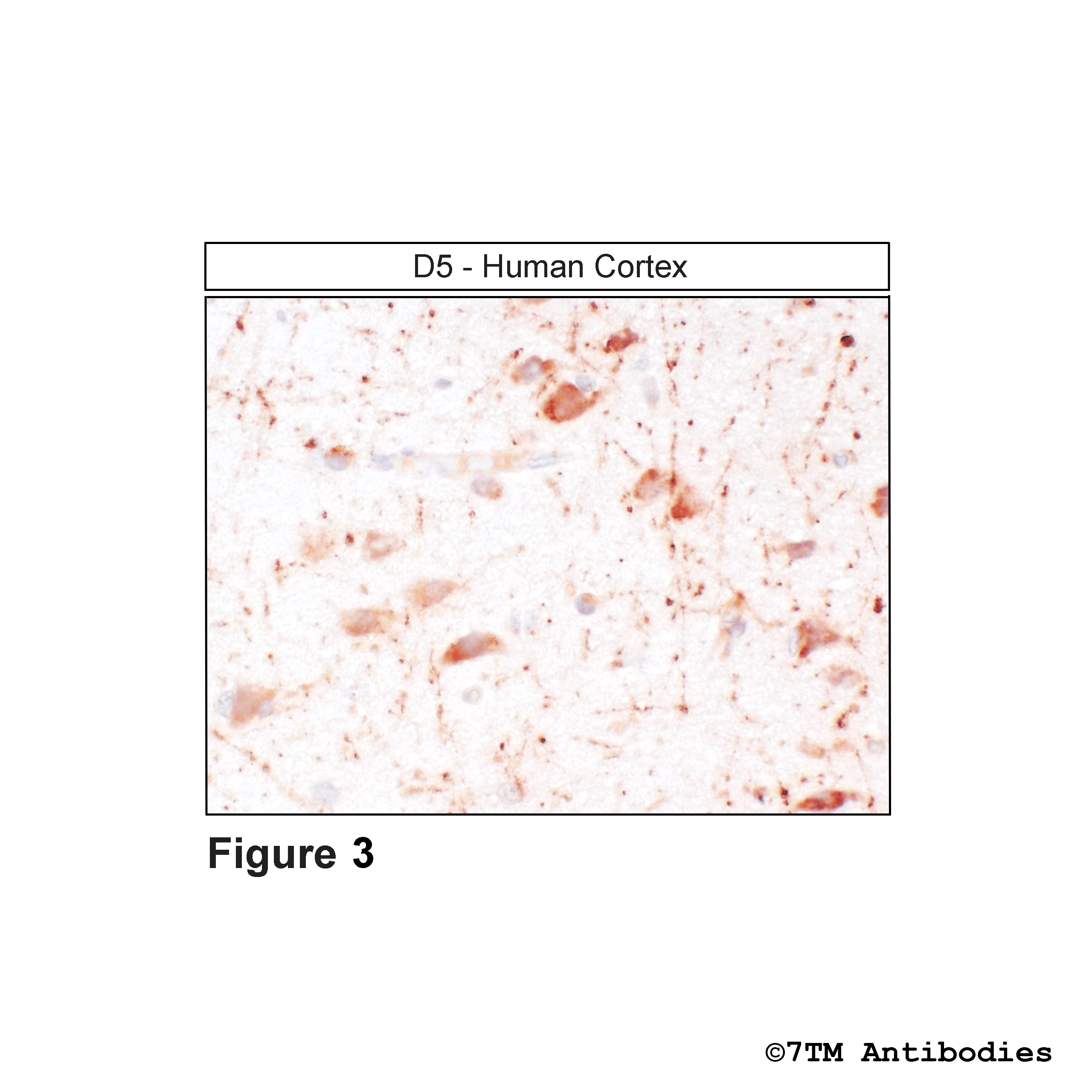 Figure 3. Immunohistochemical identification of Dopamine Receptor 5 in human cortex. Sections were dewaxed, microwaved in citric acid, and incubated with anti-D5 (Dopamine Receptor 5) antibody (7TM0218N) at a dilution of 1:100. Sections were then sequentially treated with biotinylated anti-rabbit IgG and avidin-biotin solution. Sections were then developed in 3,3-diaminobenzidine (DAB)-glucose oxidase and lightly counterstained with hematoxylin.