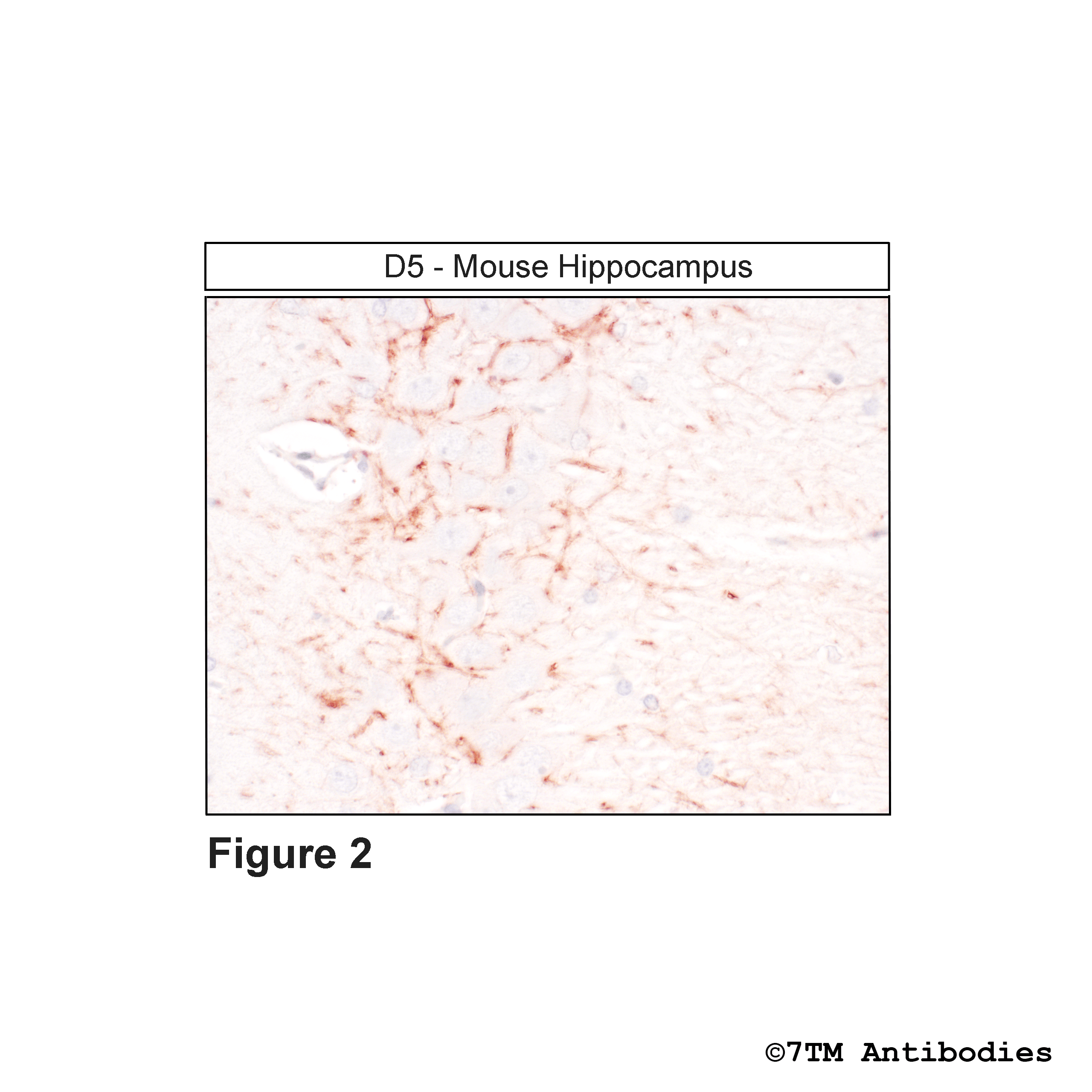 Figure 2. Immunohistochemical identification of Dopamine Receptor 5 in mouse hippocampus. Sections were dewaxed, microwaved in citric acid, and incubated with anti-D5 (Dopamine Receptor 5) antibody (7TM0218N) at a dilution of 1:100. Sections were then sequentially treated with biotinylated anti-rabbit IgG and avidin-biotin solution. Sections were then developed in 3,3-diaminobenzidine (DAB)-glucose oxidase and lightly counterstained with hematoxylin.