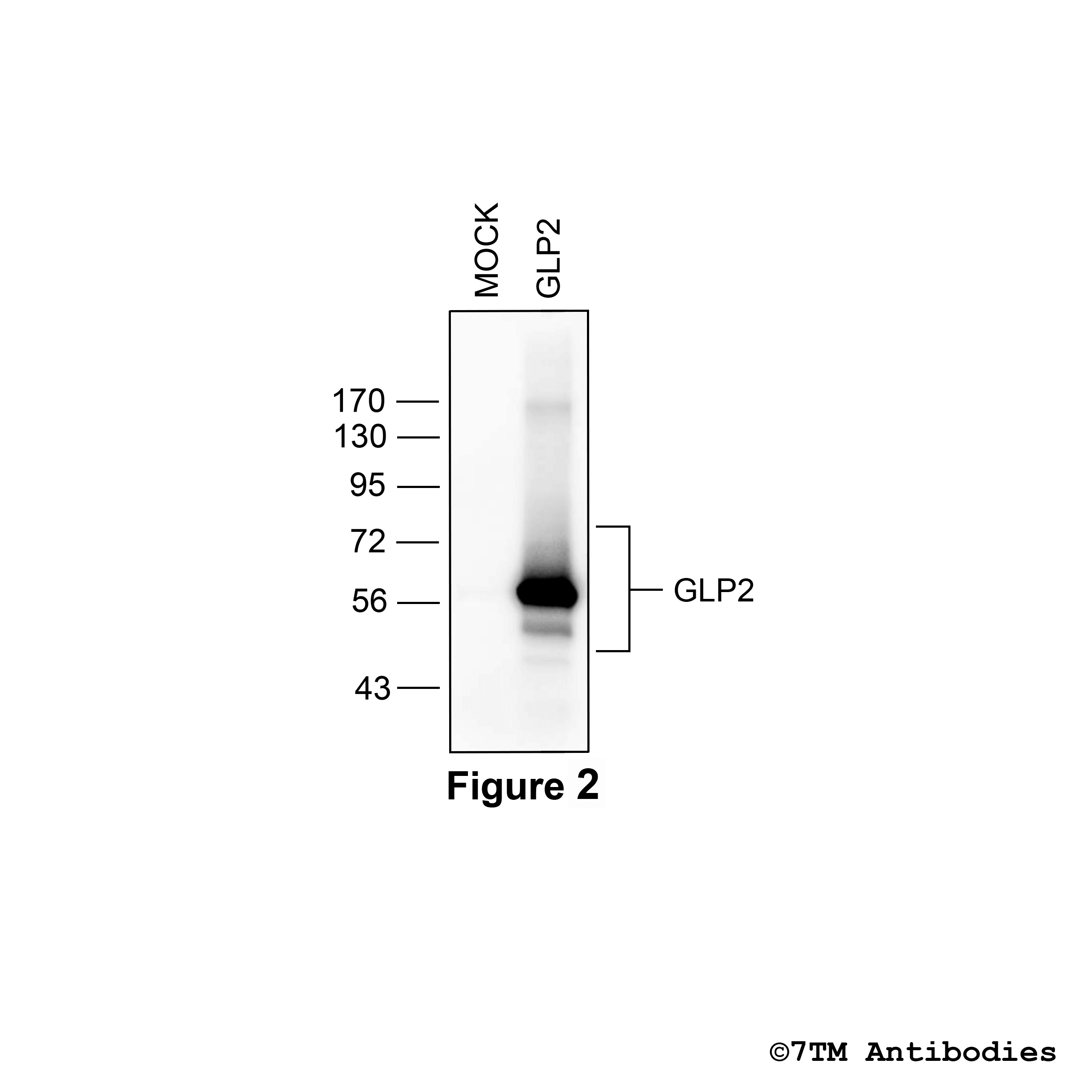 Figure 2. Validation of the Glucagon-Like Peptide 2 Receptor in transfected HEK293 cells. Native HEK293 cells (MOCK) or HEK293 cells stably expressing the Glucagon-Like Peptide 2 Receptor (GLP2) were lysed and immunoblotted with the anti-GLP2 antibody (7TM0250N-IC) at a dilution of 1:1000.