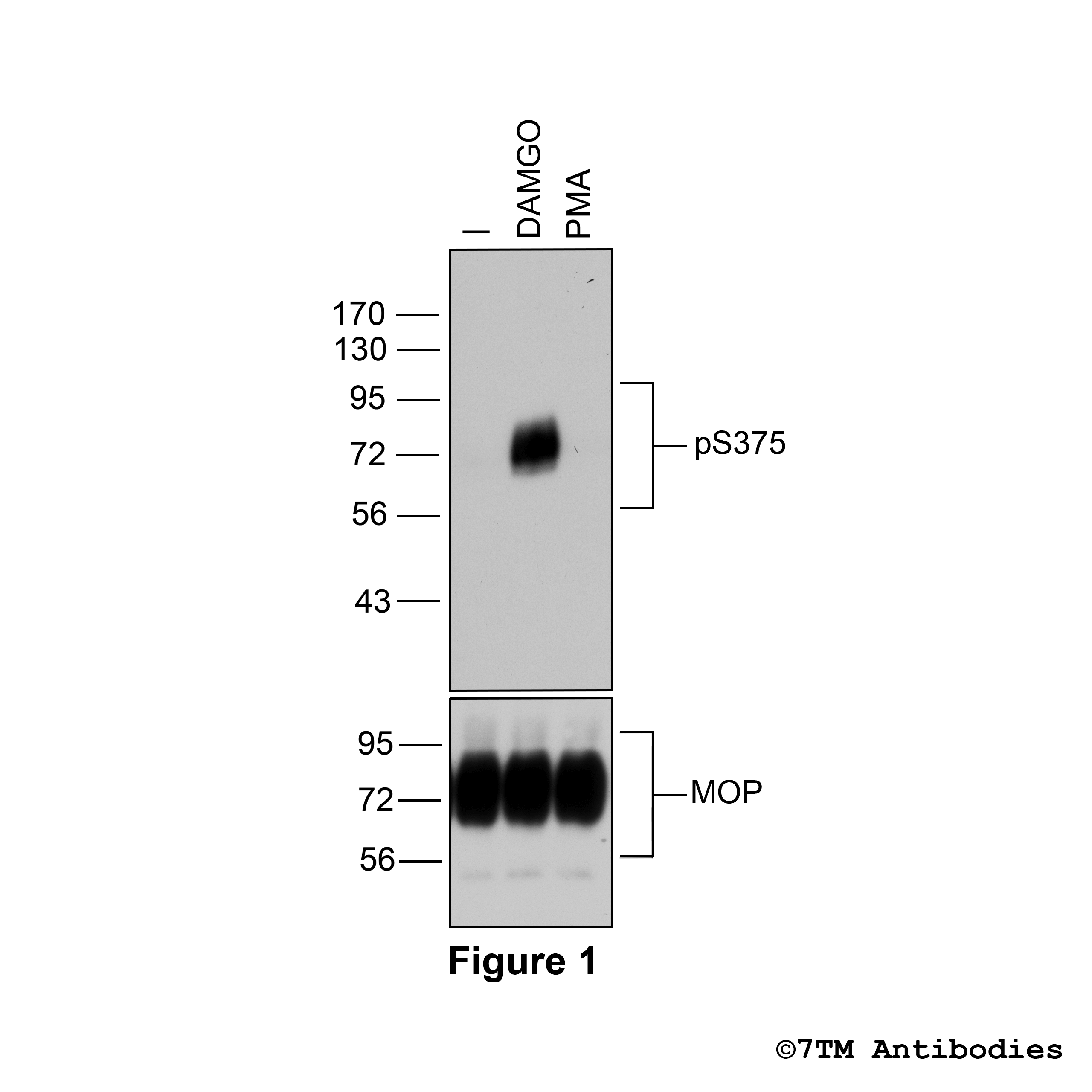 Figure 1. Agonist-induced Serine375 phosphorylation of the µ-Opioid Receptor. Upper panel, HEK293 cells stably expressing the µ-Opioid Receptor (MOP) were either not exposed or exposed to 10 μM DAMGO ([D-Ala2,N-MePhe4, Gly-ol]-enkephalin) or 0.1 μM PMA (Phorbol 12-Myristate 13-Acetate) for 30 minutes. Cells were lysed and immunoblotted with the anti-pS375-MOP antibody (7TM0319C) at a dilution of 1:1000. Lower panel, blot was stripped and reprobed with the phosphorylation-independent anti-MOP antibody (7TM0319N-WB) at a dilution of 1:1000 to confirm equal loading of the gel.