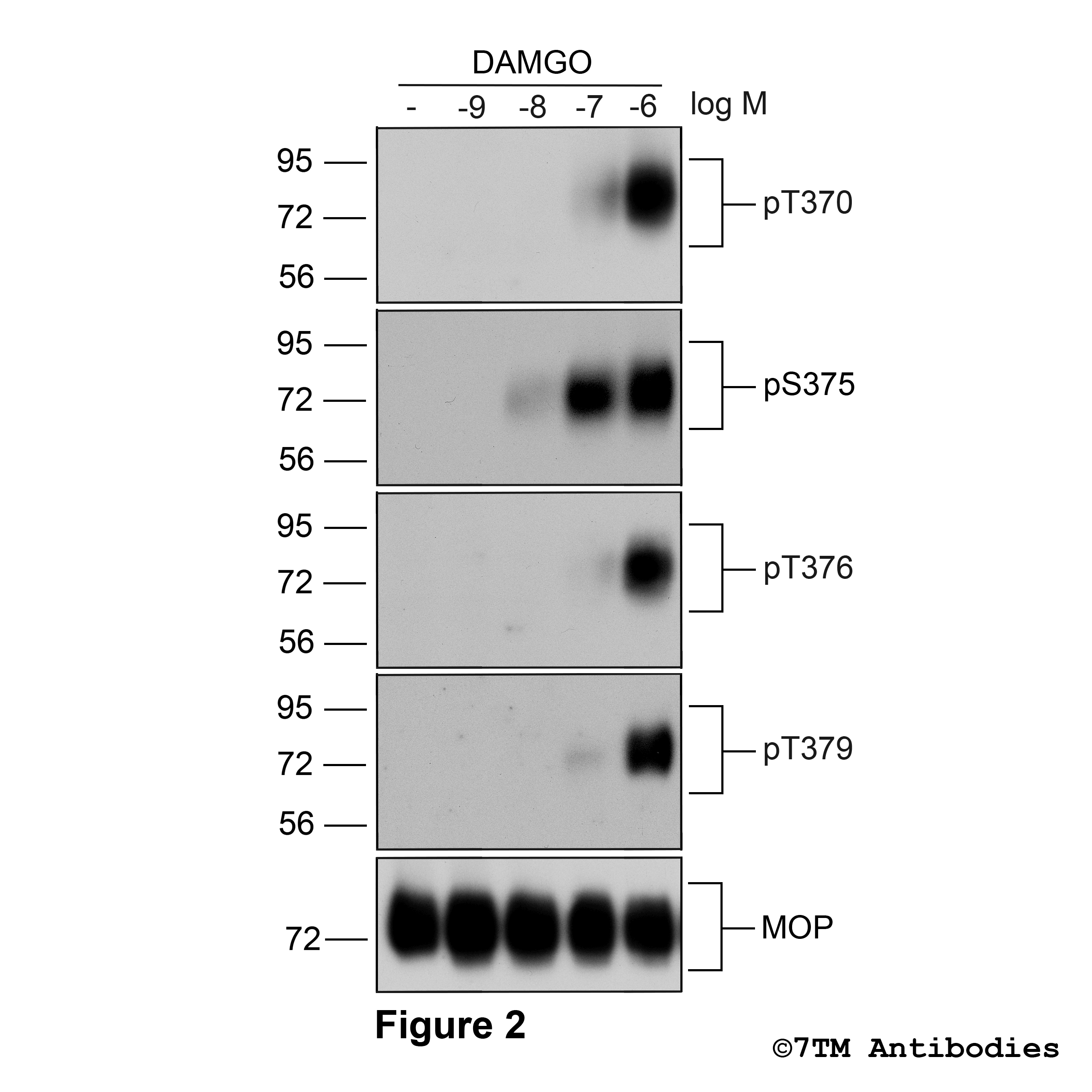 Figure 2. Analysis of dose-dependent µ-Opioid Receptor phosphorylation using a panel of phosphosite-specific antibodies. Upper four panels, HEK293 cells stably expressing the µ-Opioid Receptor (MOP) were either not exposed or exposed to increasing concentrations of DAMGO ([D-Ala2,N-MePhe4, Gly-ol]-enkephalin) ranging from 1 nM to 1 μM for 30 minutes. Cells were lysed and immunoblotted with the anti-pT370-MOP antibody (7TM0319B) or anti-pS375-MOP antibody (7TM0319C) or anti-pT376-MOP antibody (7TM0319D) or anti-pT379-MOP antibody (7TM0319E) at a dilution of 1:1000. Lower panel, blot was stripped and reprobed with the phosphorylation-independent anti-MOP antibody (7TM0319N-WB) at a dilution of 1:1000 to confirm equal loading of the gel. Note, Serine375 is the primary site of phosphorylation.