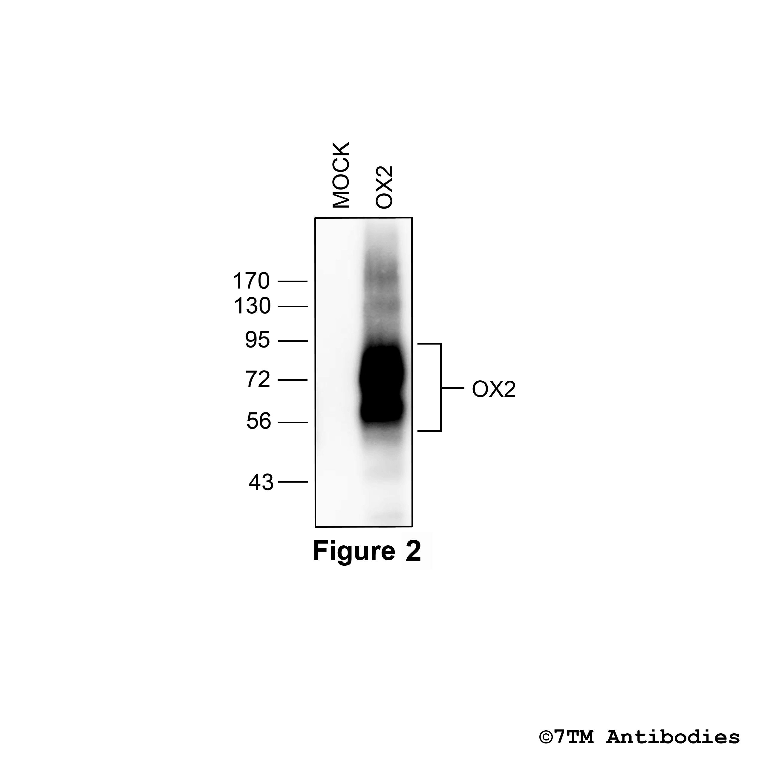 Figure 2. Validation of the Orexin Receptor 2 in transfected HEK293 cells. Native HEK293 cells (MOCK) or HEK293 cells stably expressing the Orexin Receptor 2 (OX2) were lysed and immunoblotted with the anti-OX2 antibody (7TM0322N-IC) at a dilution of 1:1000.