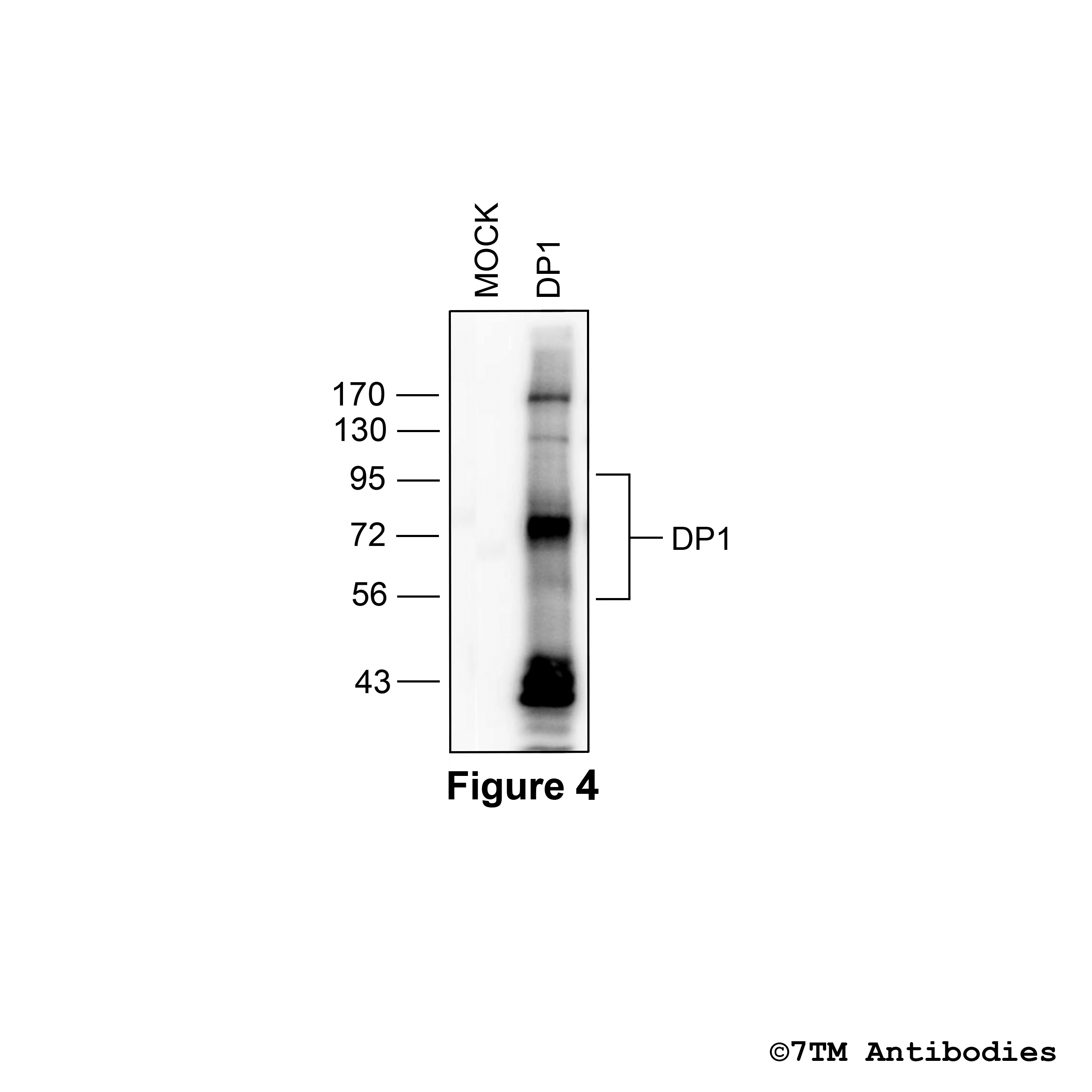 Figure 4. Validation of the DP1 Prostanoid Receptor in transfected HEK293 cells. Native HEK293 cells (MOCK) or HEK293 cells stably expressing the DP1 prostanoid receptor 1 (DP1) were lysed and immunoblotted according to 7TM Western Blot Protocol with the phosphorylation-independent anti-DP1 antibody (7TM0388N-IC) at a dilution of 1:1000.