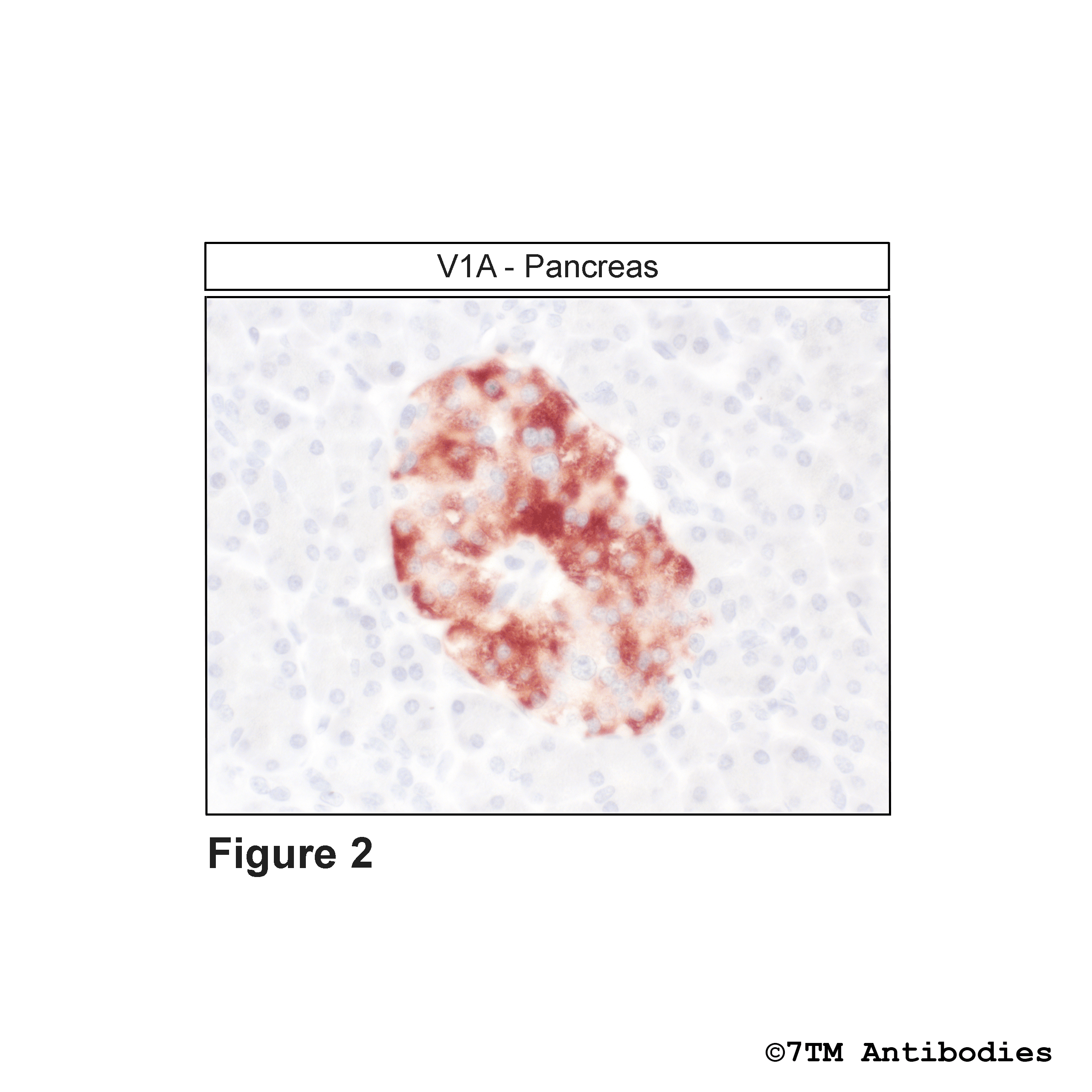Figure 2. Immunohistochemical identification of Vasopressin Receptor 1A in pancreas. Sections were dewaxed, microwaved in citric acid, and incubated with anti-V1A (Vasopressin Receptor 1A) antibody (7TM0366N) at a dilution of 1:100. Sections were then sequentially treated with biotinylated anti-rabbit IgG and avidin-biotin solution. Sections were then developed in 3,3-diaminobenzidine (DAB)-glucose oxidase and lightly counterstained with hematoxylin.